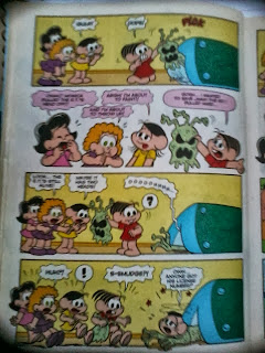 Hoje na aula de Inglês, professora Ana Paula trouxe gibis da Turma da monica, revistas e afins, todos em inglês para lermos e logo após elaborar um texto contando sobre o mesmo. Eu claro, escolhi a Turma da Mônica. Bem interessante, já no titulo "Monica's gang" já me chamou atenção, e ai qual das histórias do gibi mais me chamou atenção ? é claro que o com o tema "Tea and E.T". Confesso que eu ri que nem uma bobalhona lá na sala, e se eu pudesse teria pego o gibi para mim hehe. Bom, Monica estava com suas amigas no chá da semana, quando de repente Cebolinha pula sua janela dizendo "Corra, salvem suas vidas!! É o fim do mundo". As meninas ficam totalmente furiosas, até olharem pela janela, um disco voador. Eles ficam desesperados, e pra piorar a situação o "E.T" entra em sua casa fazendo com que se escondessem atras do sofá. Ficaram ali escondidos por um tempo, até cebolinha ter uma ideia... alguém ia lá para conversar com o E.T e ver se eles podem ser "amigos" e quem as meninas mandam ir realizar o plano ? É claro que o Cebolinha. E conversa vem, e conversa vai, as meninas atrás do sofá, estavam até achando que eles haviam mesmo ficado amigos e que o E.T era legal, até que elas ouvem um barulho suspeito. Acham que o E.T estava comendo o cebolinha. No desespero total, elas viram o sofá em cima deles, e todo machucado, cebolinha sai de baixo do sofá fantasiado de E.T e confessando tudo, dizendo que era tudo armação para entrar na festa delas. É claro que ele se deu mal.